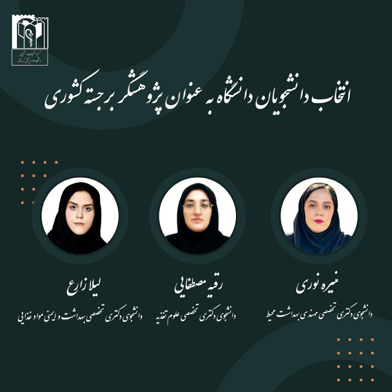 🔸 دکتر زهره رحیمی در گفتوگو با روابط عمومی دانشگاه در خصوص این موفقیت گفت: خانم منیره نوری دانشجوی مقطع دکتری تخصصی مهندسی بهداشت محیط، خانم رقیه مصطفایی دانشجوی مقطع دکتری تخصصی علوم تغذیه و خانم لیلا زارع دانشجوی مقطع دکتری تخصصی بهداشت و ایمنی مواد غذایی موفق شدند عنوان «دانشجوی پژوهشگر برجسته کشور» را کسب نمایند.