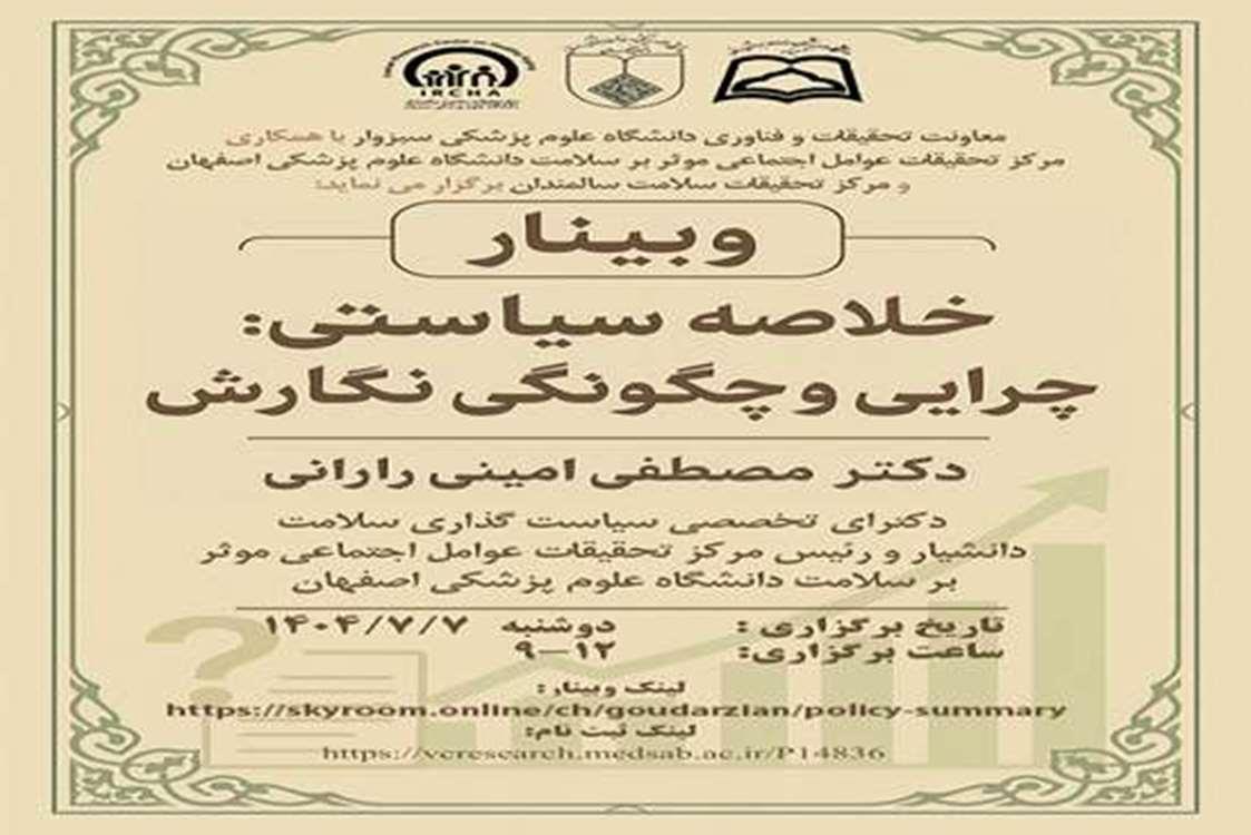 به اطلاع علاقمندان می رساند معاونت تحقیقات و فناوری دانشگاه علوم پزشکی سبزوار در نظر دارد وبیناری با عنوان خلاصه سیاستی چرایی و چگونگی نگارش را در تاریخ ۱۴۰۴/۷/۷ از ساعت ۱۲-۹ برگزار نماید.