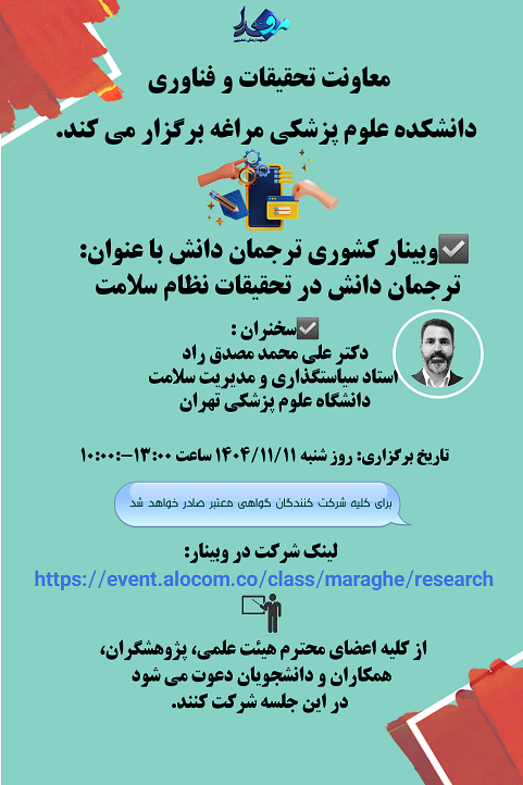 به اطلاع کلیه پژوهشگران می رساند دانشکده علوم پزشکی مراغه در نظر دارد وبینار کشوری ترجمان دانش در تحقیقات سلامت را برگزار نماید.